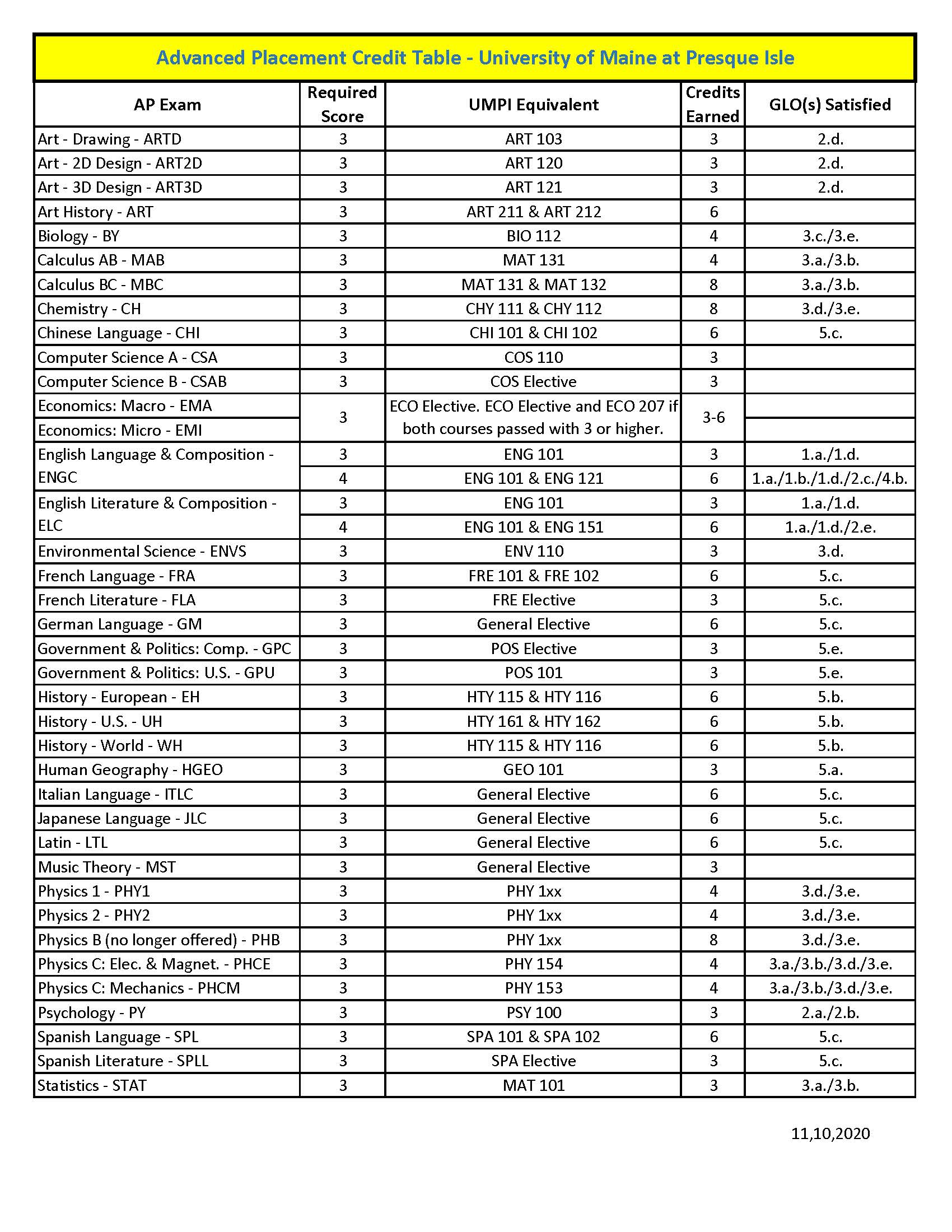 The University of Maine at Presque Isle offers several options through which a student’s previously acquired information and skills could be incorporated into their overall college program. Pertinent documentation is assembled for review by college officials and will be evaluated as quickly as possible, but may take up to several weeks.